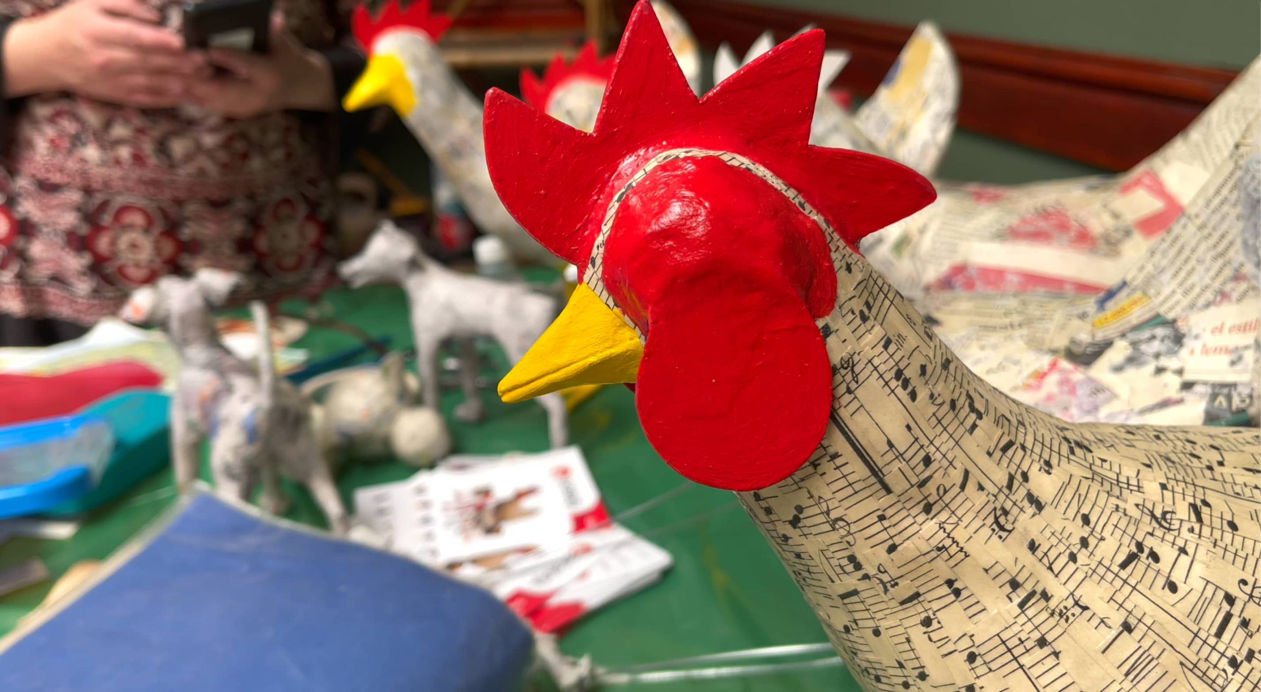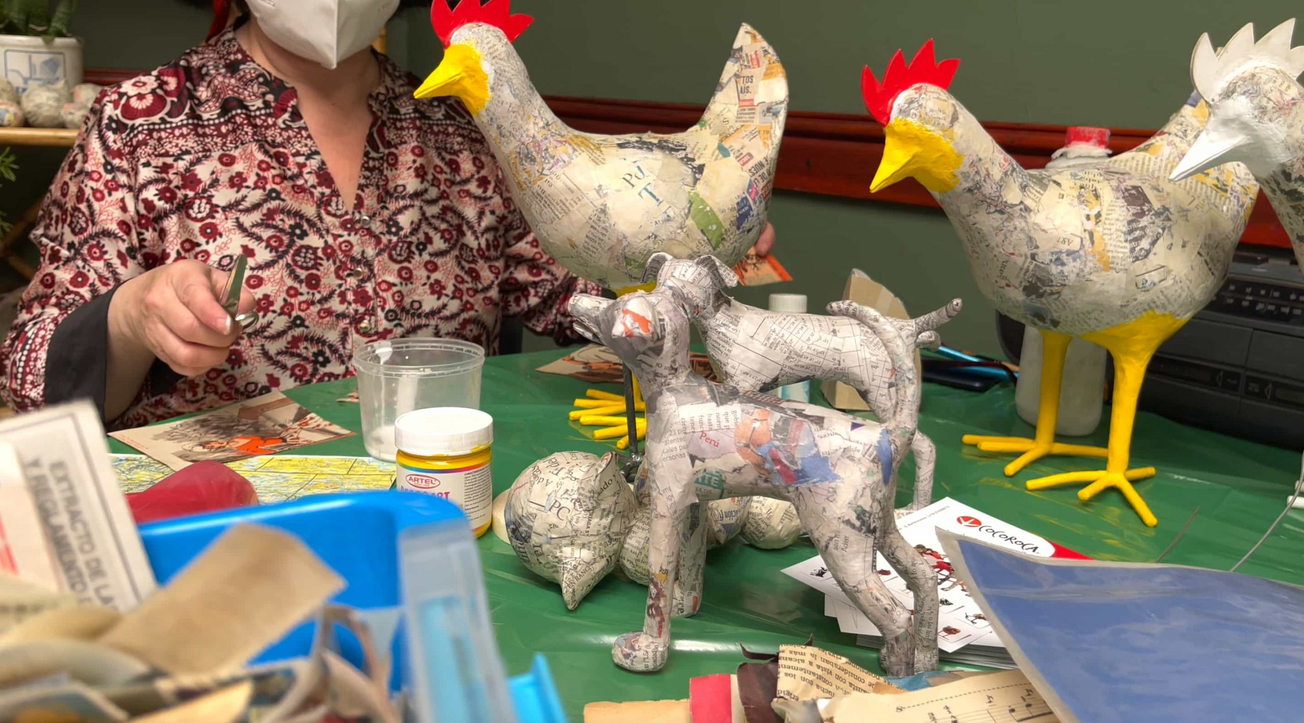 "No me gustó cómo quedaba la textura del papel maché tradicional", recuerda Rosa. Eso la llevó a investigar por internet hasta descubrir la técnica Cartapesta. El método consiste en cortar meticulosamente trozos de papel de diario, pegarlos con cola fría sobre estructuras de alambre y finalizar con fragmentos de revistas antiguas, historietas, partituras y boletos usados. Sus primeras creaciones fueron gatos, pero las ventas no alcanzaban. Dividía su tiempo entre la reposición nocturna y perfeccionar su técnica durante el día.